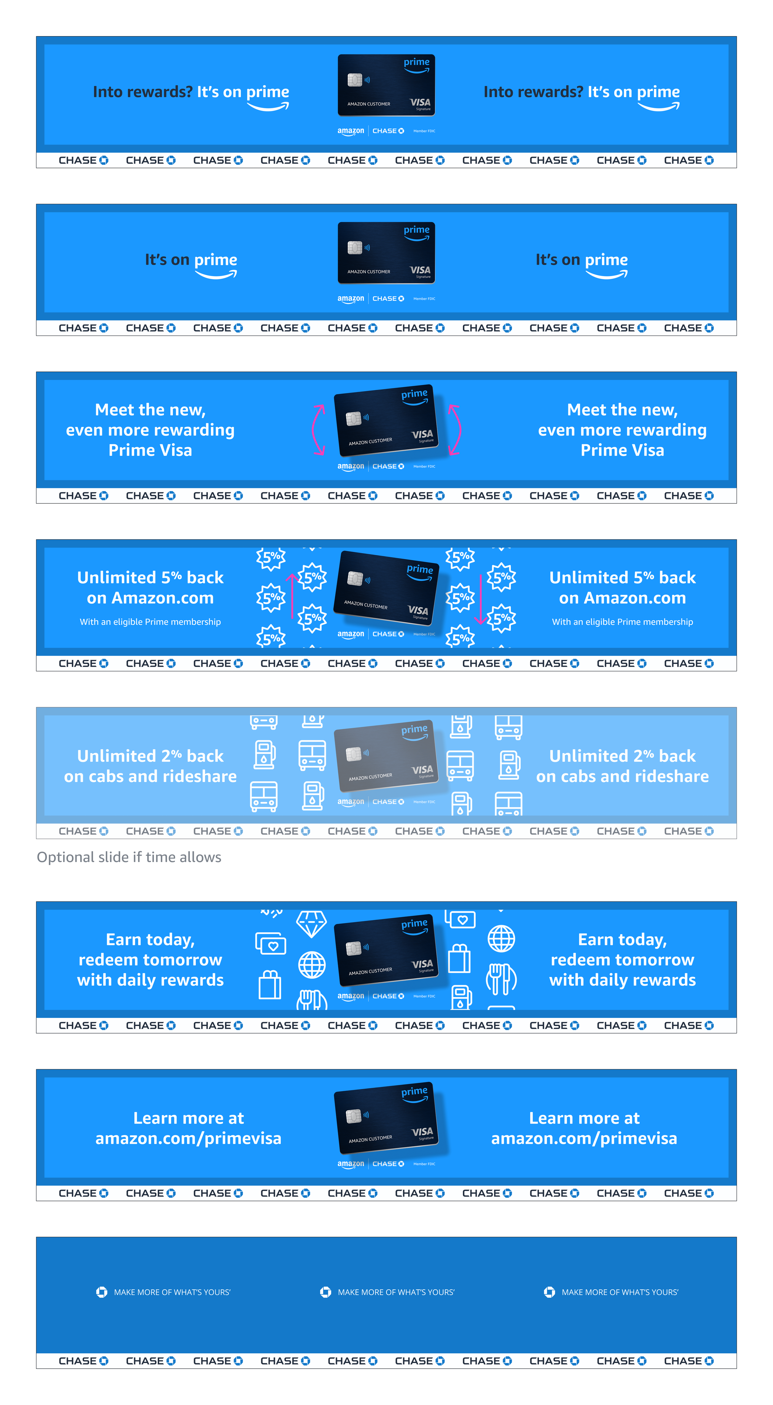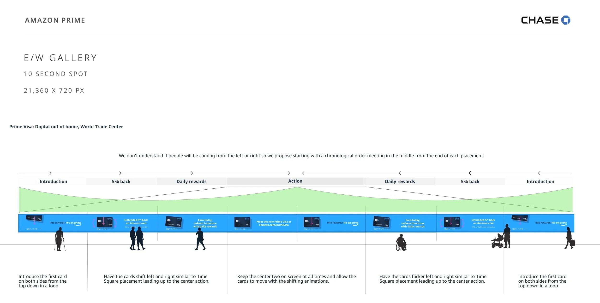 I immediately established a workback schedule, secured interim leadership alignment, and crafted three creative directions in a single day. I collaborated with Chase’s internal creative team to account for technical restrictions of the digital billboard format, ensuring our designs were both impactful and compliant. Our approach tightly aligned with Amazon’s recognizable brand assets to maximize audience resonance.